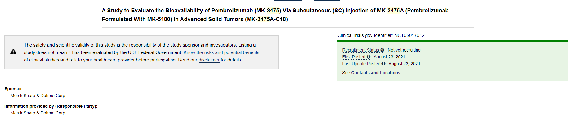 이번 임상은 진행성 고형암(MK-3475A-C18)에서 MK-3475A(MK-5180로 제형화된 펨브롤리주맙)의 피하(SC) 주사를 통한 펨브롤리주맙(MK-3475)의 생체이용률 평가 연구다.