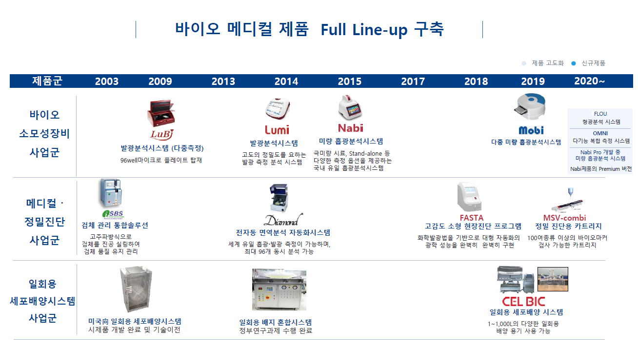 본업은 초정밀 광학기술 기반 체외진단 의료기기 업체다. 신사업으로 CEL BIC(세포배양시스템) 및 일회용 세포배양백을 2020년에 개발하였다. 일회용 세포배양 시스템은 영어로는 Single use Bioreactor으로 부른다.