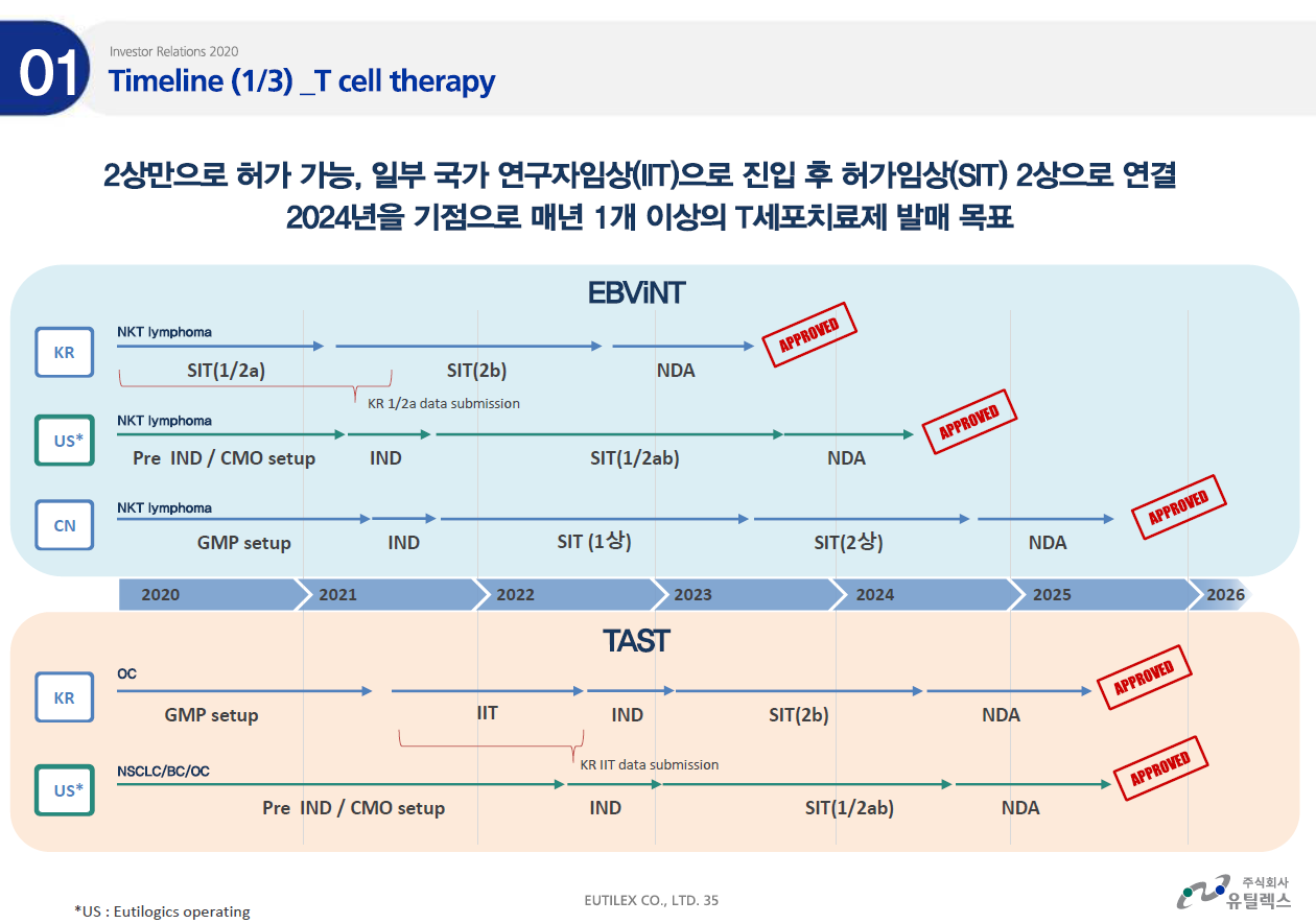 이번 계약은 EBViNT와 TAST의 미국 임상을 진행하기 위한 것이다. 유틸렉스는 현재 항체치료제인 EU101이 미국에서 임상 진행중이다. 계획대로라면 EBViNT는 올해 내로 미국 FDA에 임상 신청을 한다.