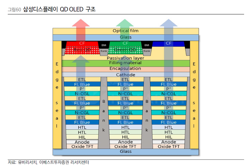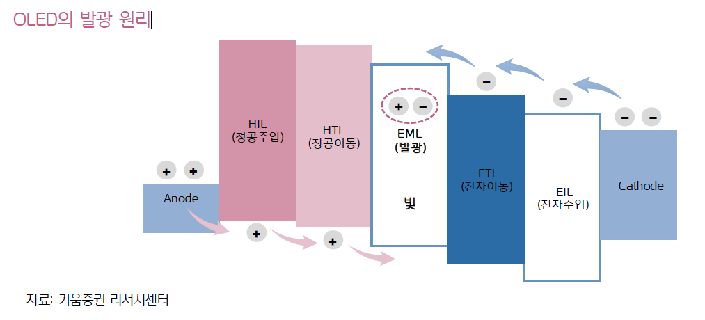 키움증권에서 한권으로 끝내는 OLED소재 기초설명서라는 제목의 리포트가 나는데 OLED의 원리부터 구조까지 아주 설명이 잘되어 있다. OLED에 대해서 문외한이라면 꼼꼼히 읽어보길 바란다.