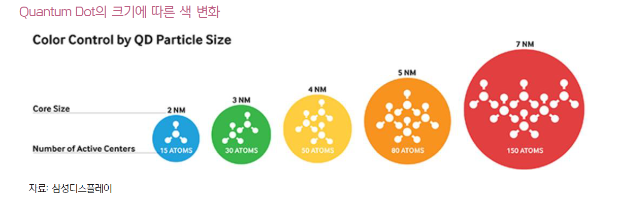 QD는 무기물 소재의 초미세 반도체 입자로, 전류를 받으면 OLED 소재처럼 스스로 발광한다. 입자 크기별로 낼 수 있는 색깔이 다른 것이 특징이다.