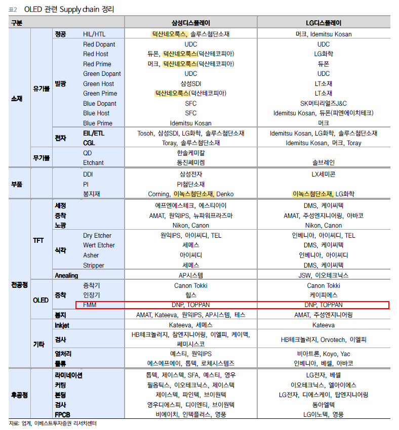 키움증권 자료는 삼성디스플레이와 소재에 국한되었다면, 이베스트투자증권자료는 LG디스플레이도 포함하며, 소부장 전체에 대해서 잘 정리되어 있다.