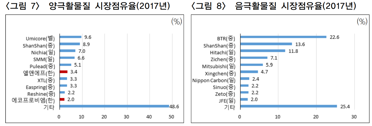 음극재 시장은 중국과 일본 기업이 장악하고 있다. 국내기업은 순위에도 들어가지 않고 국내생산업체도 포스코케미칼과 대주전자재료 두 기업밖이다. 하지만 아래 표에 있는 순위는 2018년 자료이다.
