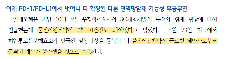 알테오젠과 추가 계약이 가능한 업체는 노바티스, GSK, 아스트라제네카, 베링거인겔하임, 머크, 리제네론 등이 언급된다.