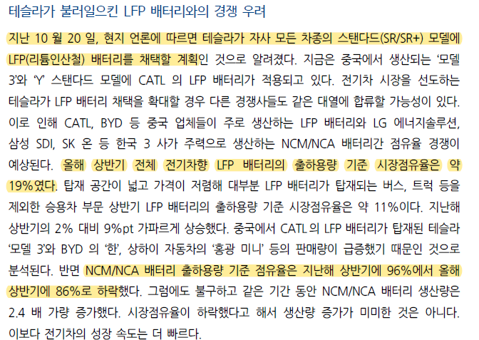 지난주 2차전지주의 하락은 테슬라가 모든 차종에 LFP배터리를 채택할 계획이라는 기사가 나왔기 때문이다.