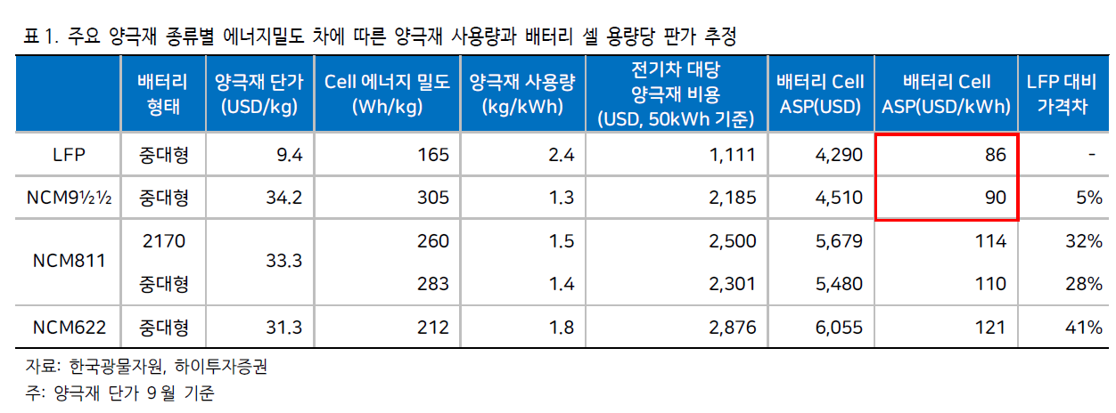 하지만 국내업체들의 NCM/NCA배터리 가격은 하이니켈일수록 결국 가격이 낮아져서 LFP와 큰 차이가 없게 된다.