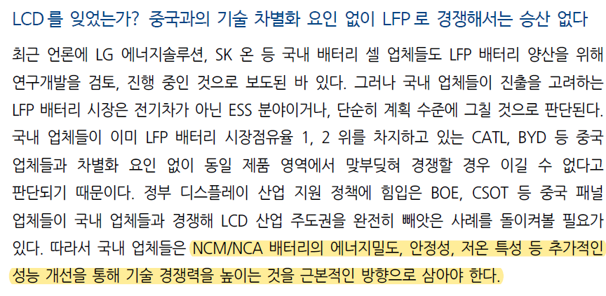LFP는 중국에서 국가적으로 밀어주고 있다. 이에 대항할 수 있는 기업은 전세계에 존재하지 않는다.