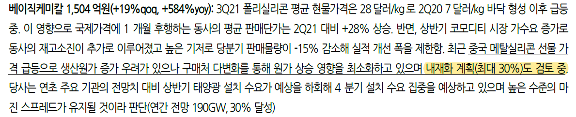 유진투자증권에서 나온 리포트를 보면 OCI에서 메탈실리콘 내재화도 계획하고 있다고 한다. 이 정보는 어제 실시한 IR자료를 통해서 추가 확인이 필요해보인다.