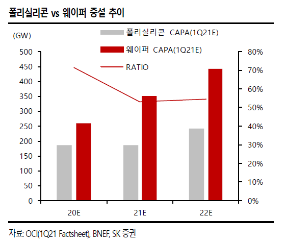 폴리실리콘과 웨이퍼의 증설 추이를 보면 웨이퍼의 증설이 더 많기 때문에 폴리실리콘의 수요는 여전히 강세라고 보면 된다.