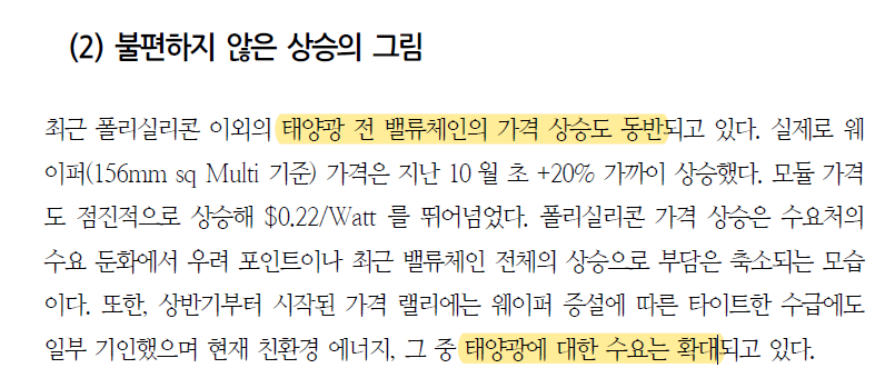 그러나 글로벌적으로 태양광 수요는 늘어나고 있고, 태양광 관련 모든 밸류체인의 가격상승이 이루어지고 있기 때문에 아직까지 주가 상승은 기대해볼 수 있다.