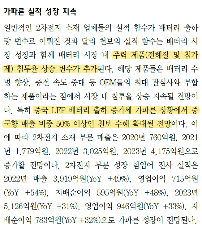 천보는 LFP시장의 성장에는 더 큰 수혜를 받는다. 천보의 주고객사가 중국이기 때문이다. 그리고 천보는 2차전지의 성장 속에서 더 배터리성능을 향상시키는 전해질 및 첨가제를 제조하기 때문에 모든 셀메이커들에게 필요한 소재다.