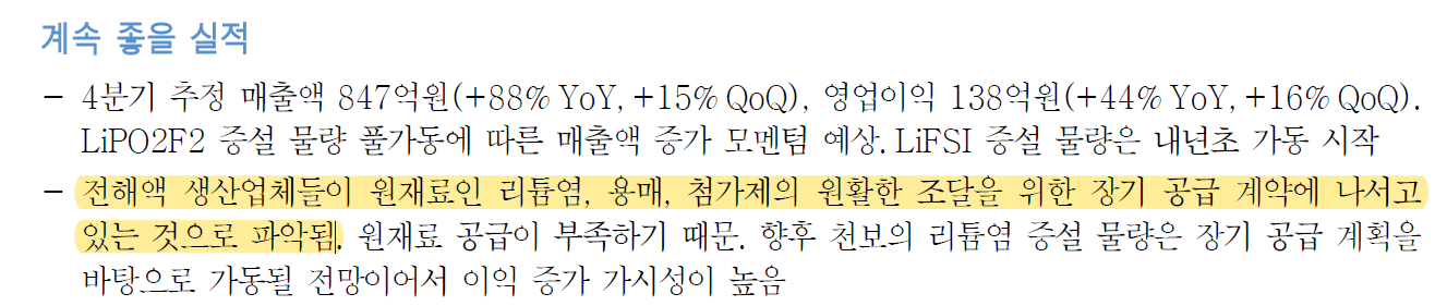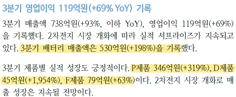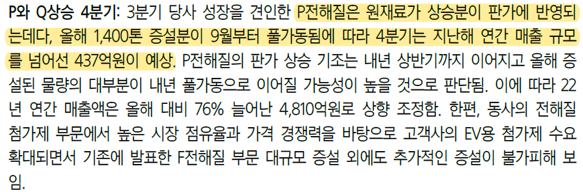 P전해질의 매출상승은 원재료 가격의 상승과 증설효과가 반영되기 했기 때문이다. 4분기에는 증설효과가 완전히 반영되기 때문에 매출이 3분기보다 더 클 것으로 예상된다.