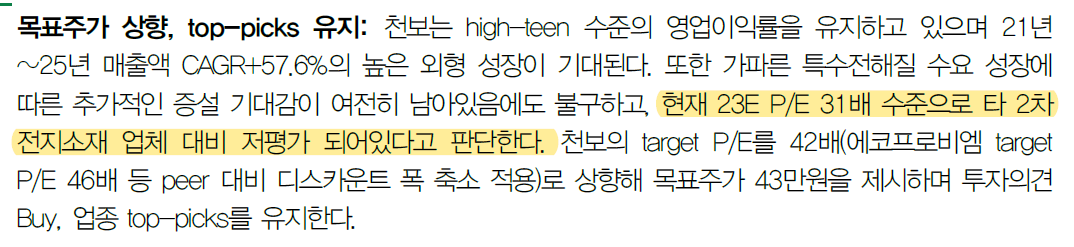 현재 시점에서 가장 싼 소재기업이 천보고 성장여력이 가장 높아보이는 기업도 천보다.