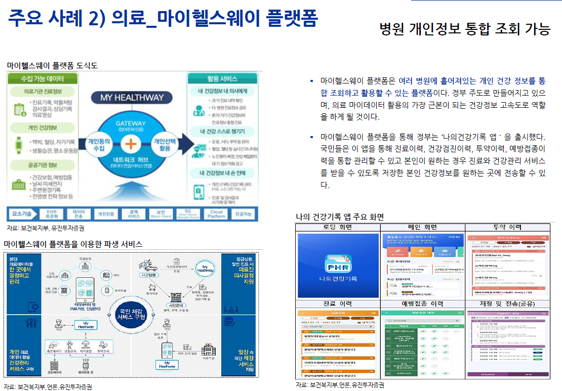 주요 사례 중에서 "나의 건강기록" 앱은 마이데이터를 이용한 마이헬스웨이 플랫폼이다.