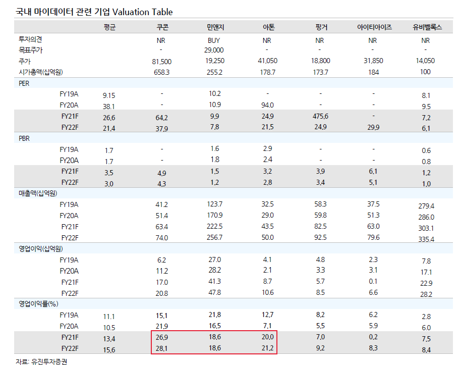 영업이익률은 쿠콘이 제일 좋으며 민앤지, 아톤도 나머지 기업들에 비해서는 훨씬 좋다.