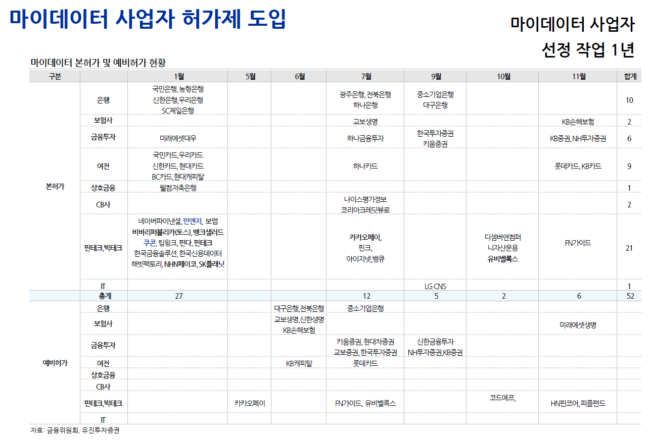 마이데이터 사업본허가를 받은기업은 11월 기준으로 52개 기업이다. 금융권 업체가 대부분이다.