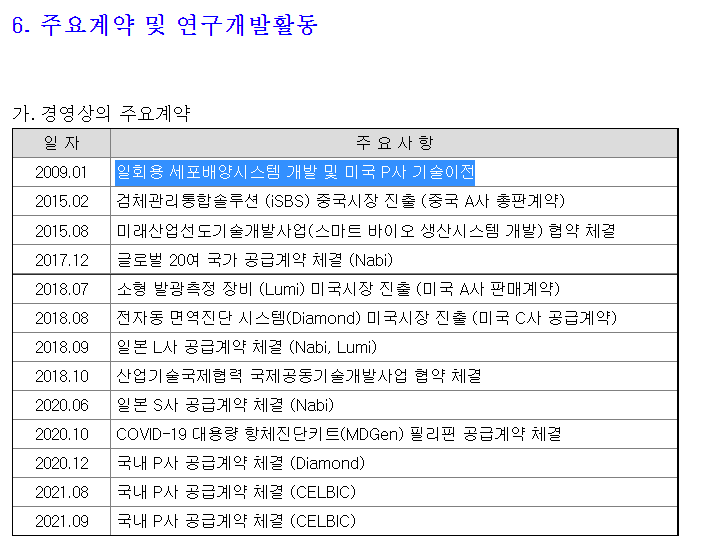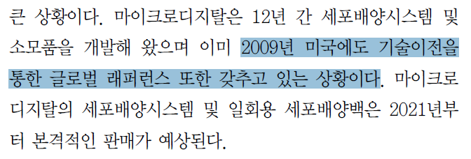 본 리포트에는 마이크로디지탈의 일회용 세포배양시스템이 미국의 P사로부터 기술이전을 받았다고 적혀져 있는데 이부분은 잘못된 정보다.