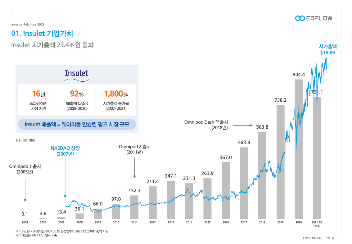 시총 20조에 매출1조다. 이 시장에서 이오플로우가 10%만 먹어도 매출 1000억이다. 시장은 점점 커지고 있고, 이오플로우가 인슐렛이 없는 중국과 중동 등에서 시장을 확보한다면 매출은 어느정도일지 감히 상상이 되지 않는다.