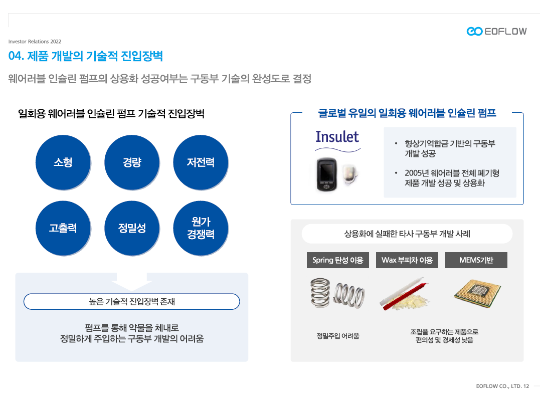 웨어러블 인슐린 펌프의 핵심은 구동부다. 여러 업체들이 도전했지만 소형, 무게, 저전력 등 여러가지 이슈로 인해 성공하지 못했다. 이오플로우만 유일하게 성공한 도전자인 셈이다.