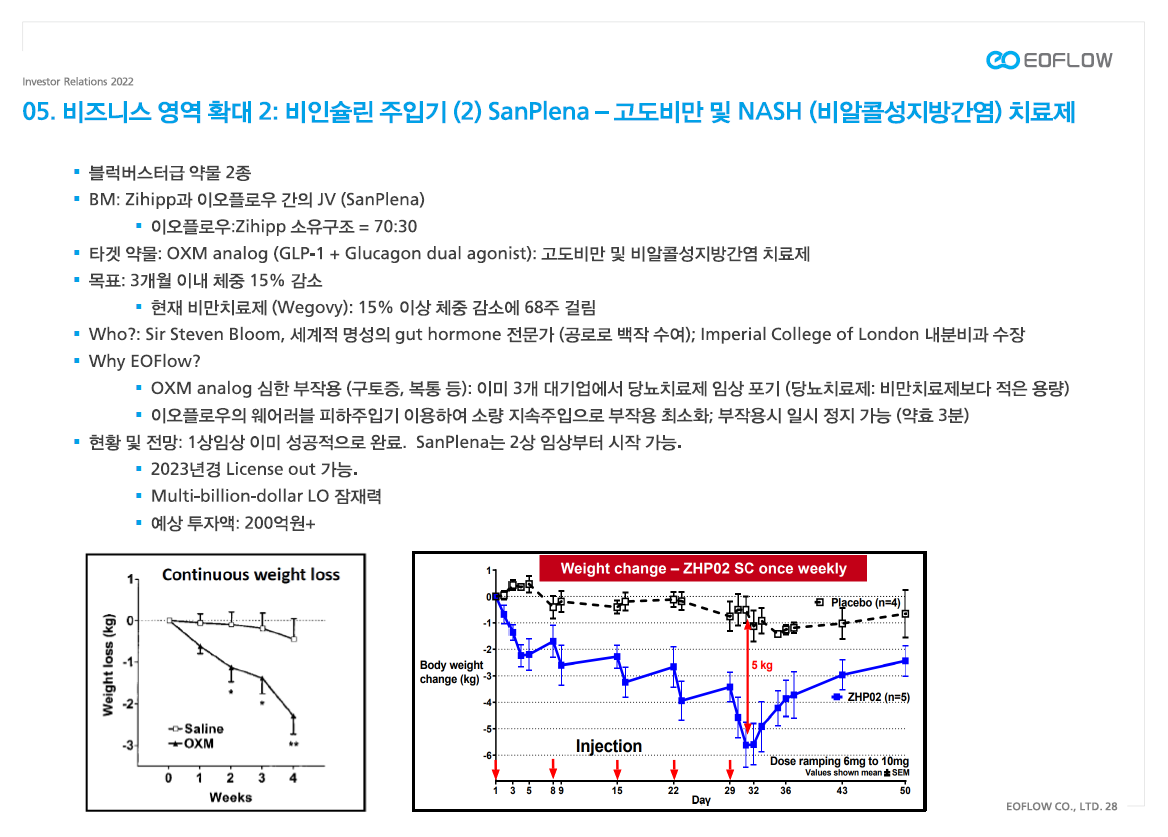 자이힙과 JV를 통해 설립한 산플레어를 통해서 비만 시장을 공략한다. 데이터만으로는 현재 비만치료제인 위고비보다 뛰어난 효능을 자랑한다. 이미 임상1상도 끝났으니 곧 임상2상에 들어갈 예정이다.