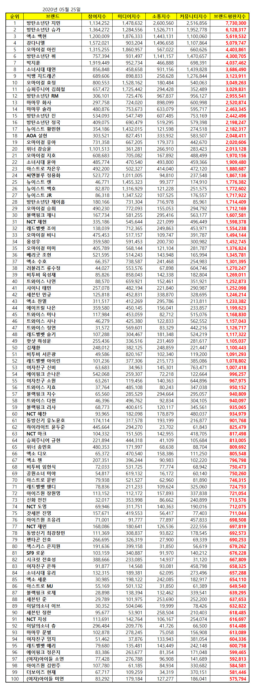 아이돌 개인 100대 브랜드평판 2020년 5월 빅데이터 분석결과, 1위 방탄소년단 지민 2위 방탄소년단 슈가 3위 엑소 백현 순으로 분석되었다.한국기업평판연구소는 아이돌 개인 브랜드평판 빅��