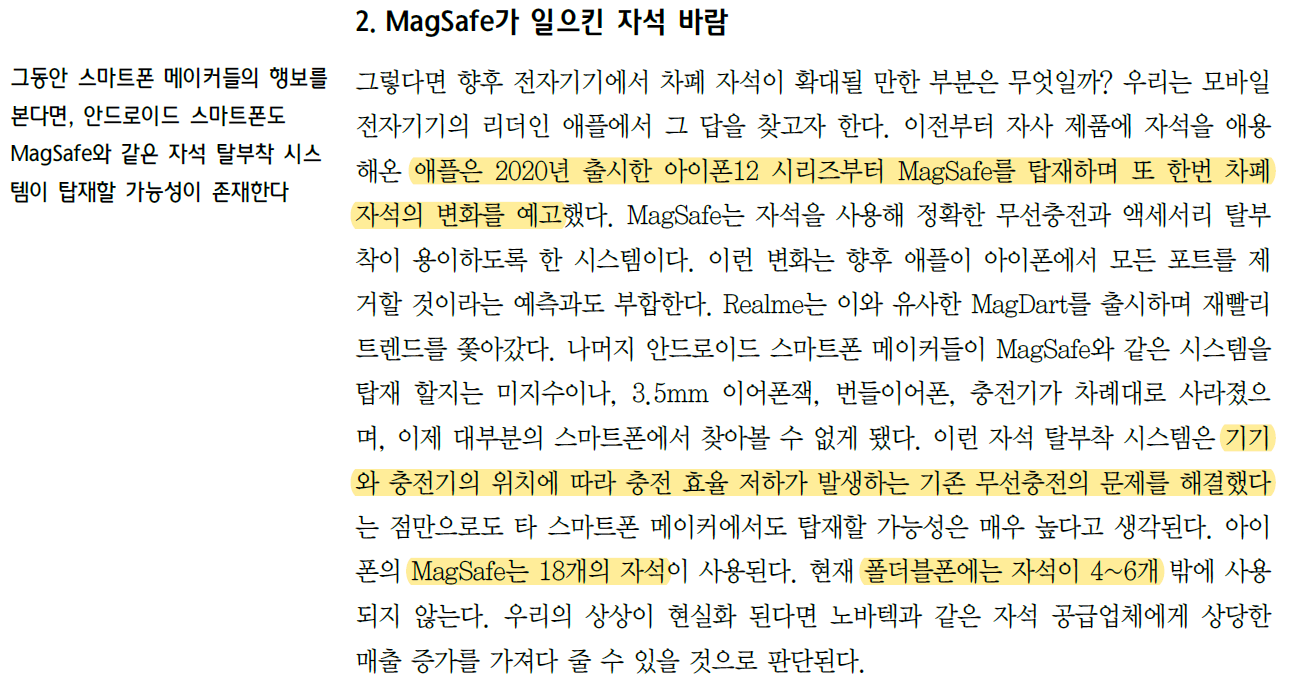 새로운 성장을 위해서는 갤럭시 시리즈가 애플의 맥세이프와 유사한 무선충전을 용이하게 하는 자석시스템을 적용하는 것이다. 지금까지의 아이폰의 행보를 대부분의 스마트폰 제조업체는 그대로 따라왔다. 갤럭시도 마찬가지다.