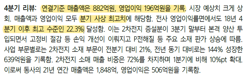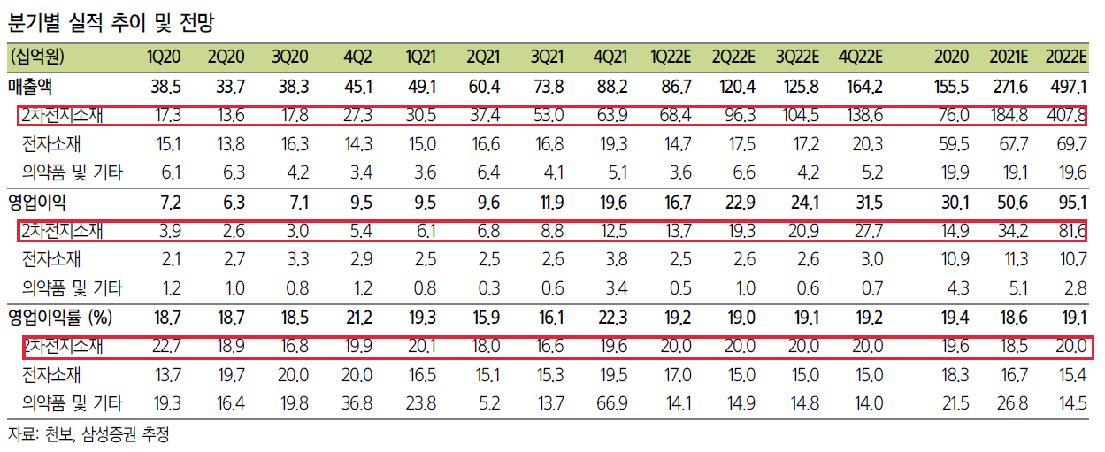 P전해질 증설효과와 원재료 LiPF6 가격 상승 효과가 나타난 것이다.