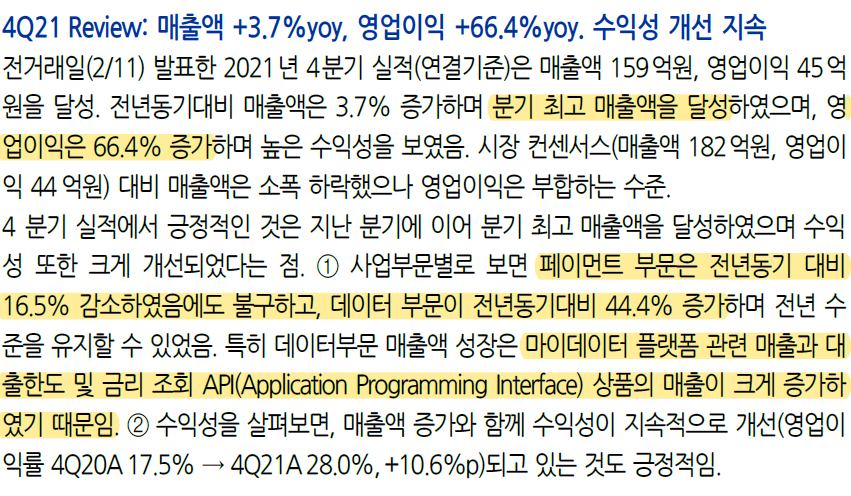 올해 1월 4일부터 본격적인 마이데이터 사업이 시작되었으니 앞으로 데이터 부문의 매출이 더 좋아질 것은 두말할 필요도 없다.
