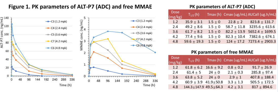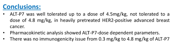 - HER2양성 유방암에서 ALT-P7은 4.2mg/kg까지는 내성이 있으나, 4.8mg/kg은 독성 관찰됨.
