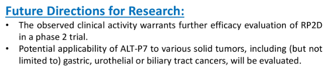 결론은 ALT-P7은 PR 2명이 있지만 임상2상 권장용량이 아닌 독성이 발생한 용량이었고, 임상권장용량에선는 PR은 커녕 CR도 발생하지 않았다. ALT-P7을 너무 긍정적으로는 보지말고 객관적인 시각에서 바라보자. 물론 임상2상에서 더 좋은 성과를 내길 진심으로 바란다.