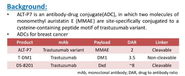 - ALT-P7은 항체 약물 결합체로, 모노메틸오리스타틴E(Monomethyl oristatin E)의 두 분자가 사이트별로 결합되어 트라스투자밥 변종의 시스테인을 함유한 펩타이드 모티브가 된다.