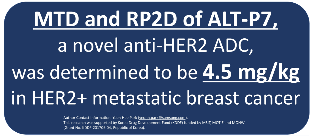 새로운 HER2 ADC 치료제인 ALT-P7의 HER2양성 전이성 유방암에서 최대허용용량(MTD)과 임상2상 권장용량(RP2D)은 4.5mg/kg으로 결정되었다.