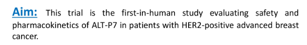 목적: HER2 양성 유방암 환자에서 ALT-P7의 안전성과 약동학을 평가하는 인간 최초 연구다.