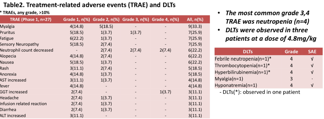 투여용량을 크게 할수록 약물반응이 효과를 보였으며, 투여용량 4.8mg/kg에서 PR이 관찰되었다. 하지만 투여용량 4.8mg/kg에서 독성도 관찰되었다.
