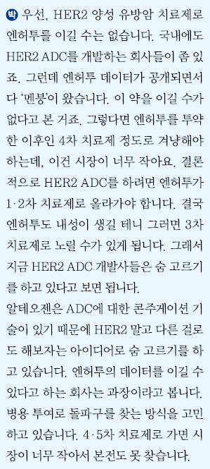 ALT-P7 임상1상 이후 이렇다할 이벤트가 없는 것은 엔허투가 너무 강하기 때문이다. 엔허투가 1,2차 치료제로 가면 다음 스텝을 고려한다는 전략이다.