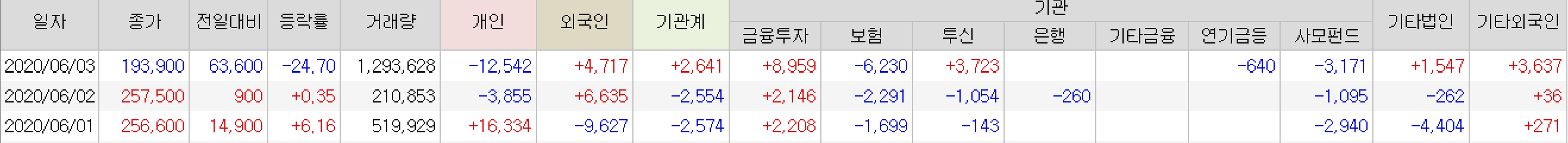 그 결과 개인들만 팔았고 기관, 외국인, 금융투자 등은 순매수를 하였다. 결국 외국인은 지분율을 0.04% 늘렸다.