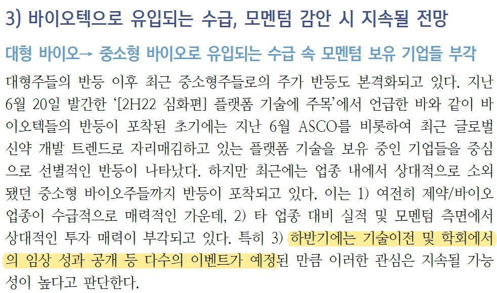 신한금융투자는 하반기는 기술 이전 및 학회에서 임상데이터 발표가 있기 때문에 바이오 섹터가 괜찮다고 보고 있다.