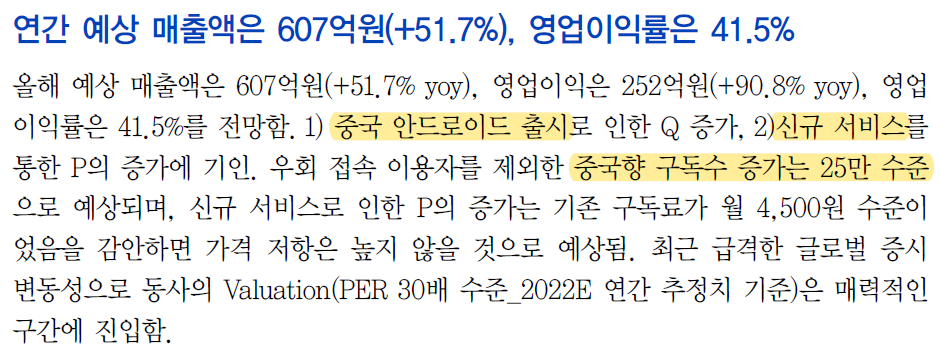 3분기에 중국 안드로이드 출시가 되면 중국에서의 구독수가 25만정도 증가할 것으로 보고 있다.