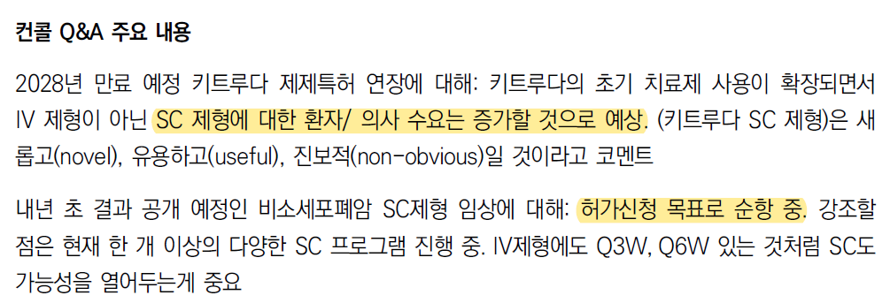 키트루다SC의 수요는 증가할 것이며, 현재 진행중인 SC제형 임상은 허가신청 목표로 순항 중이라고 한다.
