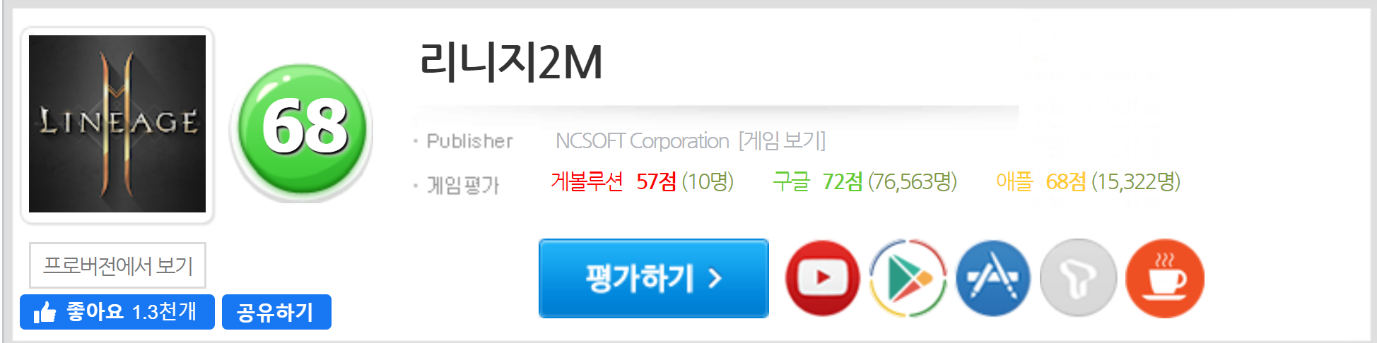 리지지2M가 게임평가 점수를 비교해보자. 아직 뮤 아크엔젤에 대한 앱스토어 점수는 올라오지 않았으니 구글 플레이스토어 평가 점수만 비교해보자.