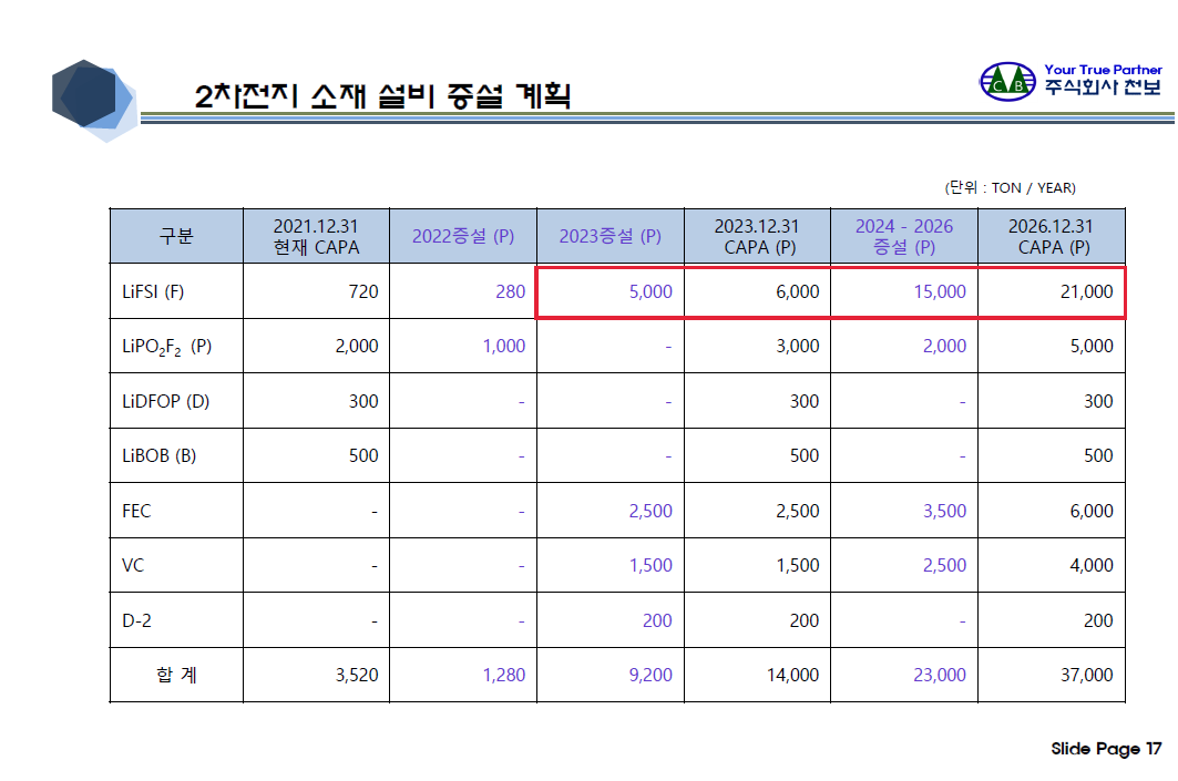 내년부터 본격적인 증설물량 공세가 시작된다. 천보를 아직까지 주목해야하는 이유다.