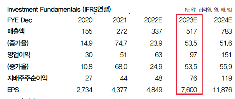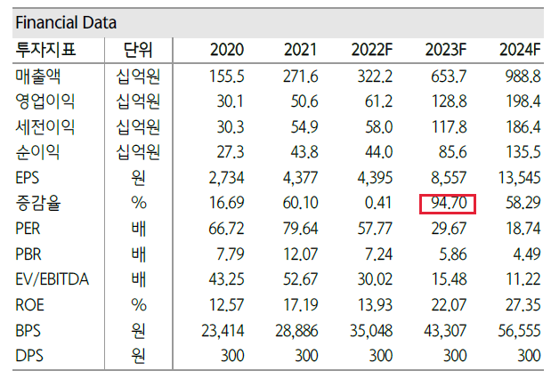 증권사들의 2023년 EPS증감률 추정치를 보면 삼성증권이 제일 보수적으로 32.4%며, 하나금융투자가 94.7%로 가장 높다.