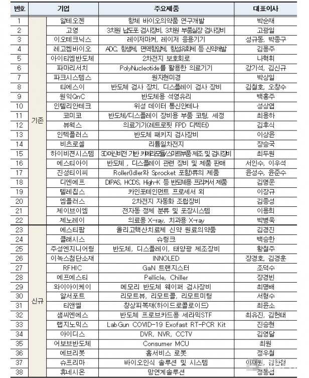 기존 22개 기업에 신규 기업 16개사 추가 선정…기술력·성장 가능성 방점 알테오젠과 에스티팜 등 38개사가 '2022년 코스닥 라이징스타' 기업으로 선정됐다.