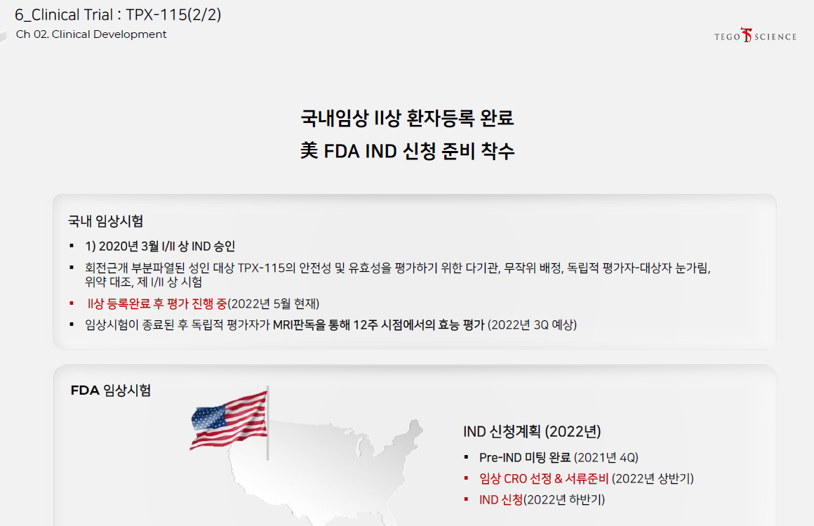 테고사이언스는 TPX-115 미국 임상을 2상으로 신청하기로 했다. 현재 임상 2상 신청에 필요한 여러 옵션들을 전달받아 서류를 준비 중이다. 올해 초 미국 CRO(임상수탁기관)도 고용했다. 시기를 '이르면 올해 12월'로 정한 것은 한국 임상 결과를 반영하기 위해서다. 테고사이언스는 올해 9~10월 TPX-115 국내 임상이 끝날 것으로 보고있다. 국내 임상 결과 반영을 위해 2개월 시차를 뒀다.