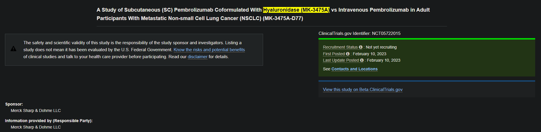머크의 키트루다SC 임상3상이 클리니컬 트라이얼즈에 등록되었고, 알테오젠이 홈페이지에 파트너사의 임상3상이 시작되었음을 공지했다.