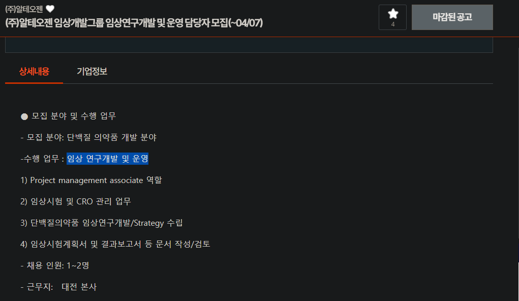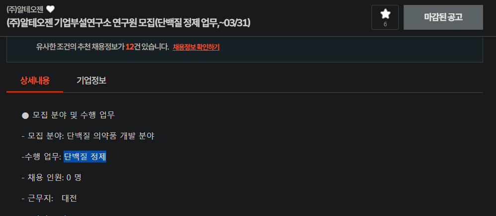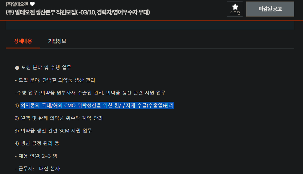 알테오젠은 인력도 꾸준히 채용하고 있는데, 인크루트 홈페이지에서 어떤 담당자를 채용하고 있는지 체크해보자.
