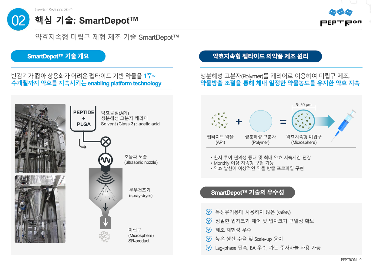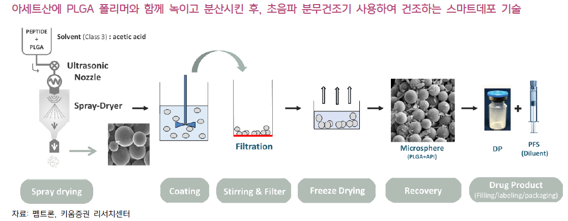 - SmartDepot™ 기술은 초음파 분무건조를 이용해 생분해성 고분자인 PLGA와 펩타이드 약물을 마이크로스피어로 캡슐화해주는 방식