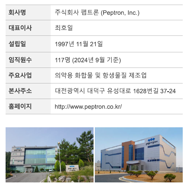 ① 회사 개요: 주식회사 펩트론은 대전광역시 유성구에 본점을 두고 있으며, 대표이사는 최호일임