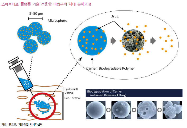 스마트데포는 반감기가 짧아 자주 주사하는 펩타이드(아미노산 화합물) 약물을 현재 주 1회 주사보다 투여 주기를 늘릴 수 있는 기술이다. 주로 수술용 생분해성 실로 쓰이는 ‘PLGA’를 구형(미세구체)으로 만들어 약물전달체로 사용한다. 이 생분해성 물질이 시간이 지나 분해되면서 이 물질에 섞여있던 약물이 방출되는 식이다. 이 미세구체의 원료와 함량에 따라 1개월 제형, 3개월 제형, 6개월 제형 등의 의약품을 개발해낼 수 있다.