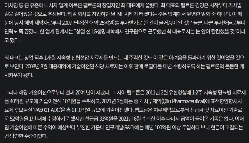 “내년 일라이릴리와 비만 치료 주사제 기술이전 계약 체결 논의를 본격화할 계획입니다. 계약이 성사되면 연매출이 수조원에 이를 것으로 기대됩니다.”